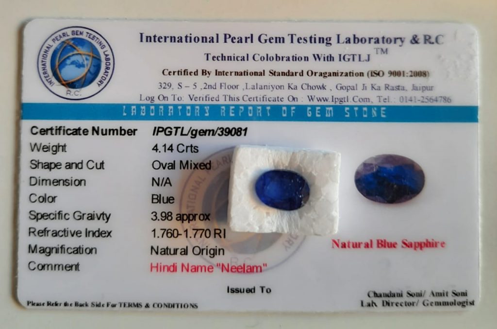 - Real NILAM stone (natural blue sapphire)
